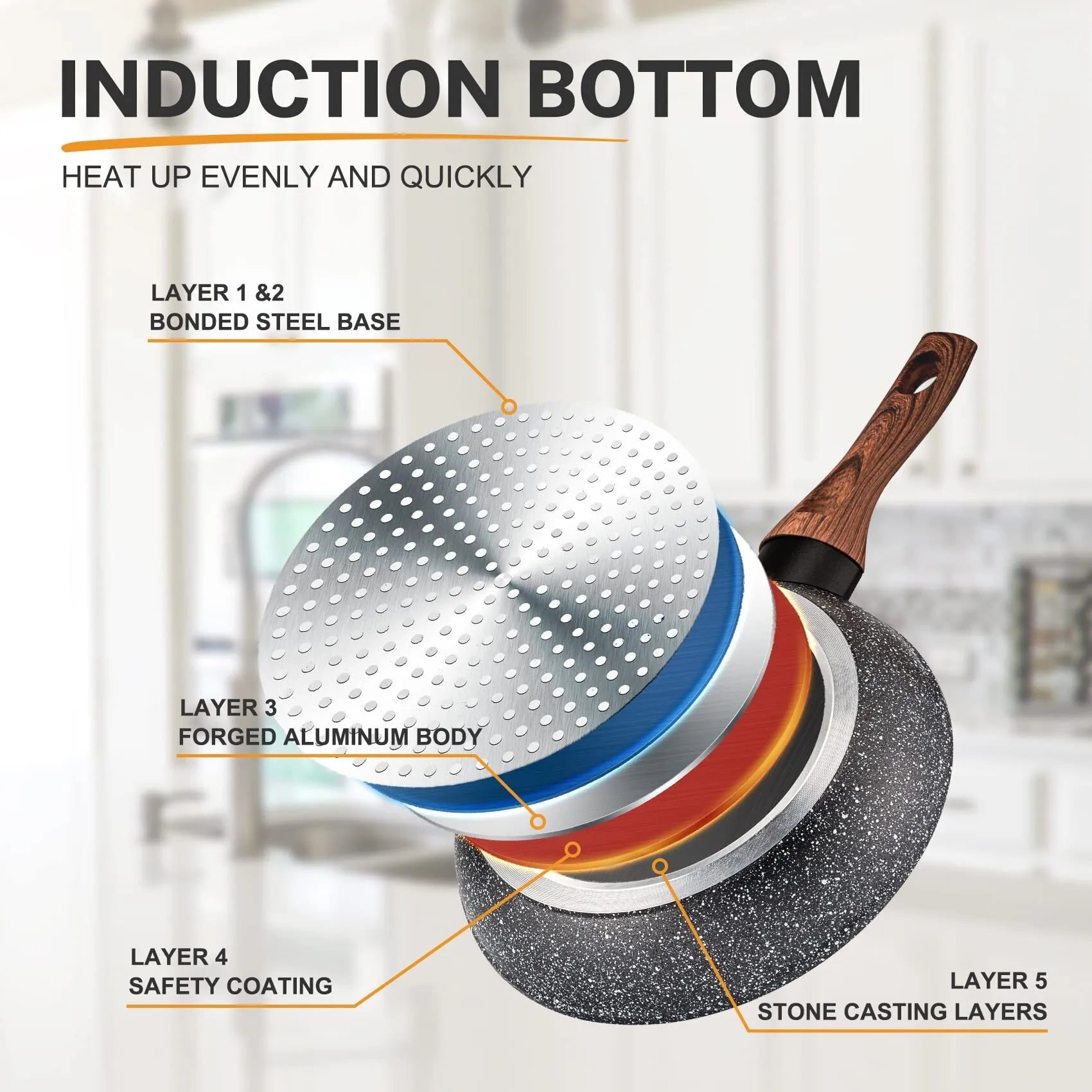 【Eco-Friendly Material】Eco-friendly non-stick cookware set adopts 5-layer technology, which is more durable and safer. The multi-layer process also allows for faster heating and longer life than traditional nonstick pans