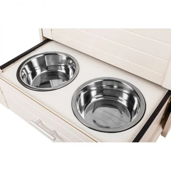 This double food bowl storage container is the perfect space-saving solution for your home. Store the dog food in the angled door pantry, then pull out the bottom drawer at feeding time to reveal two stainless steel bowls. No more stepping in food and water bowls that are always underfoot, or having dogs snack all day: you can tuck away the food bowls when they’re not in use. Plus, it’s much more attractive than stray bits of kibble and a loose bag of dog food.Features
