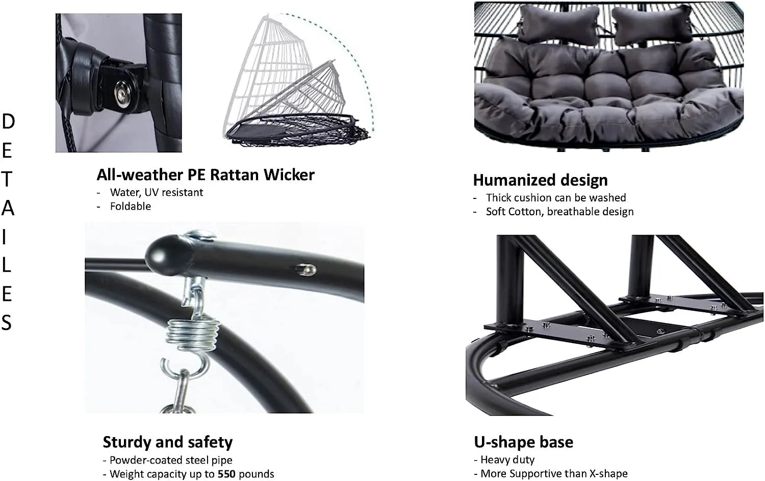- 【Sturdy Swinging Chair】The two seater egg hanging chair is constructed by 10 metal keels and UV protected polyethylene rattan resin wicker, supported by powder-coated steel stand, assembled by 304 stainless steel accessories, This functional hammock chair is simple yet tasteful, easily matches the style of any bedroom, patio, backyard, and more!