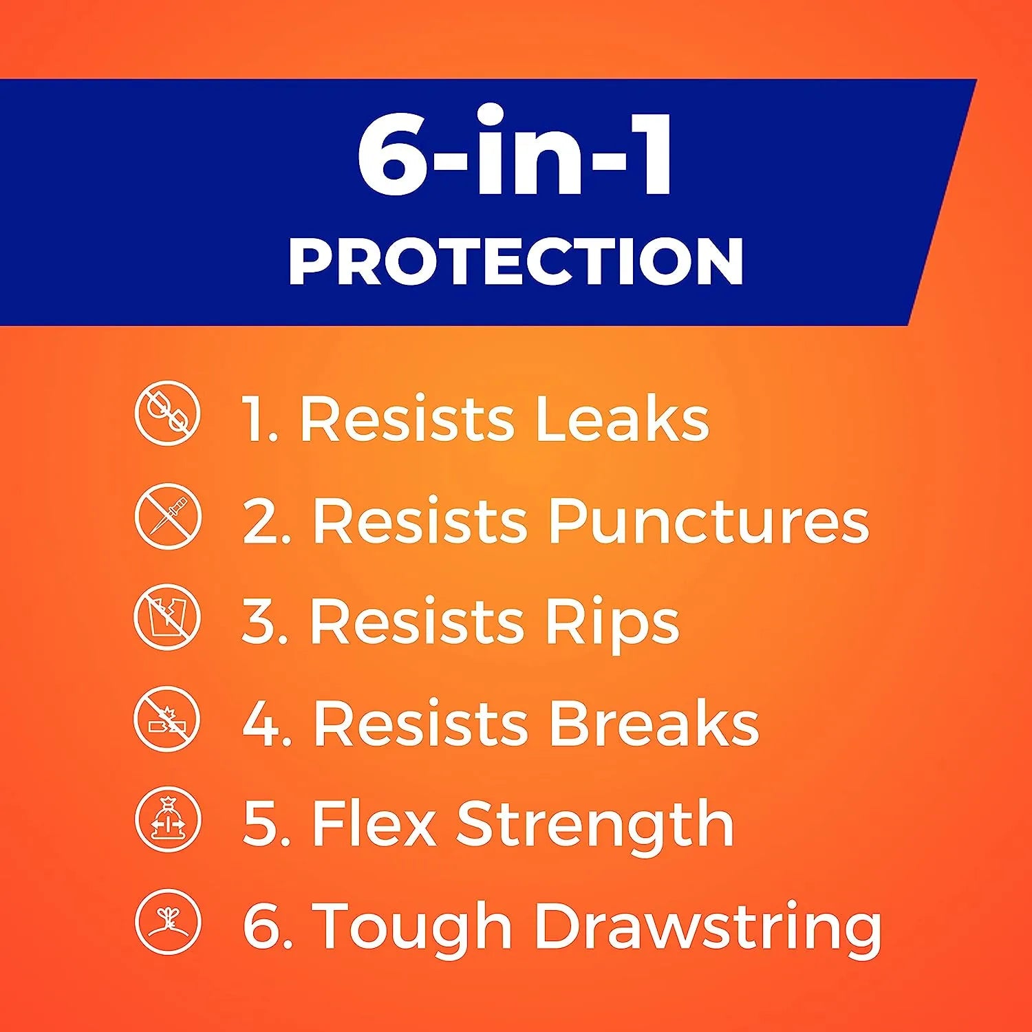 - TRIPLE-ACTION TECHNOLOGY—These kitchen garbage bags, stretch and expand to accommodate oversized loads without punctures, leaks or tears