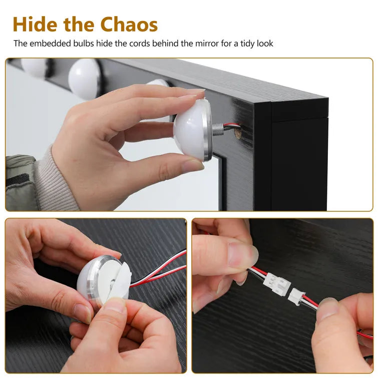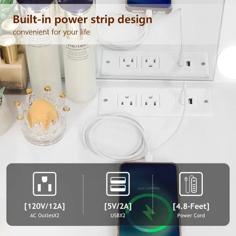 - Vanity Set With Charging Station: Owning a makeup vanity table with a charging station (2 standard plug sockets & 2 USB ports included) makes it no need to find an extra power outlet for your hair dryer/curling iron and instantly completes a perfect hairstyle in front of this vanity.