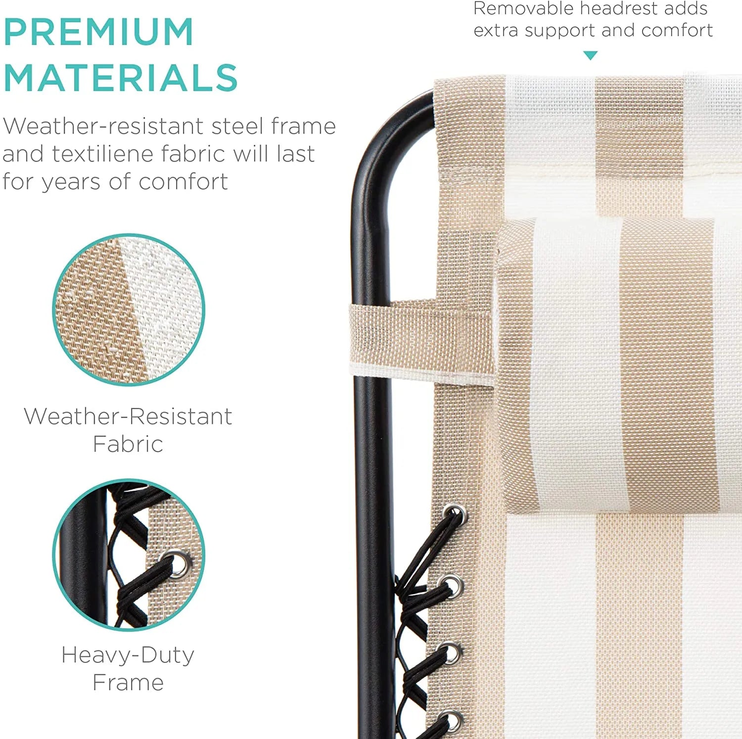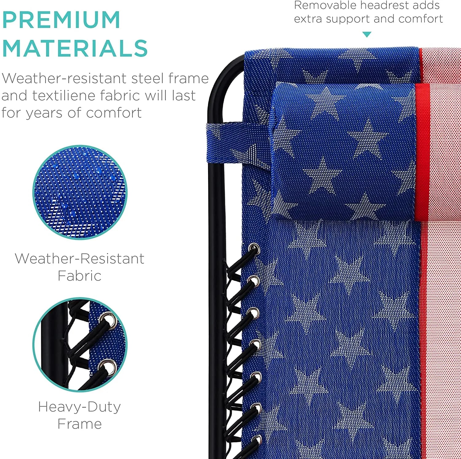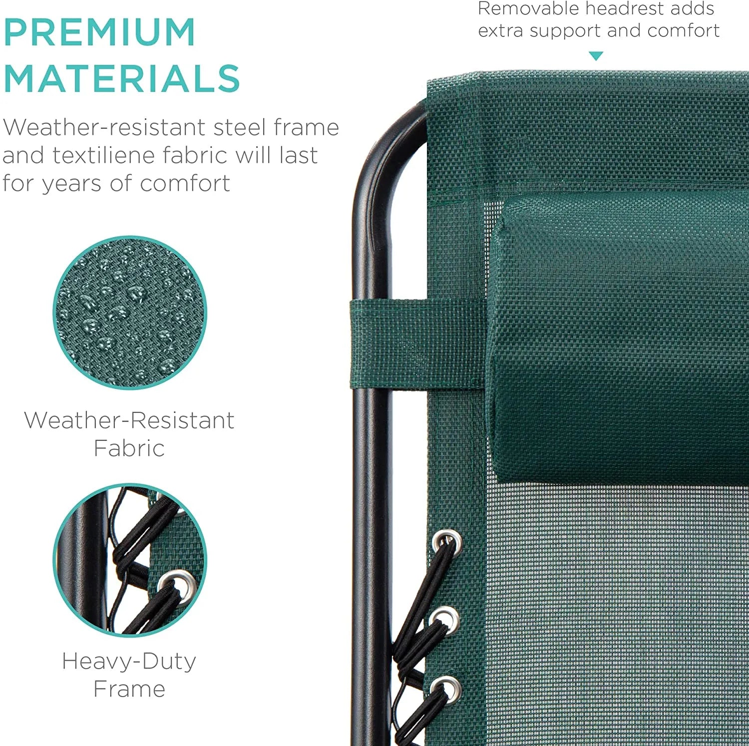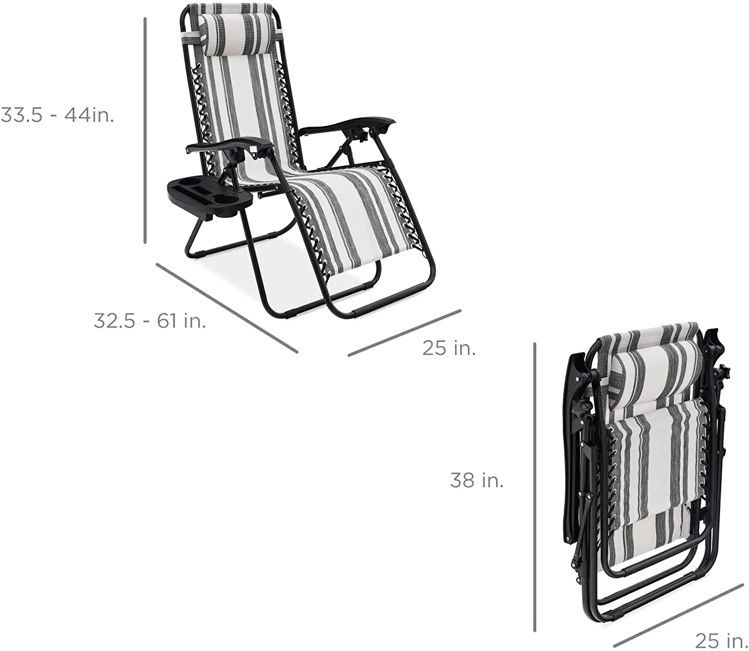 - REMOVABLE, ADJUSTABLE HEADRESTS: Includes a removable, padded headrest for an extra element of adjustable comfort; OPEN DIMENSIONS: 32.5"-61"(L) x 25"(W) x 33.5"-44"(H); FOLDED DIMENSIONS: 38"(L) x 25"(W) x 6"(H)