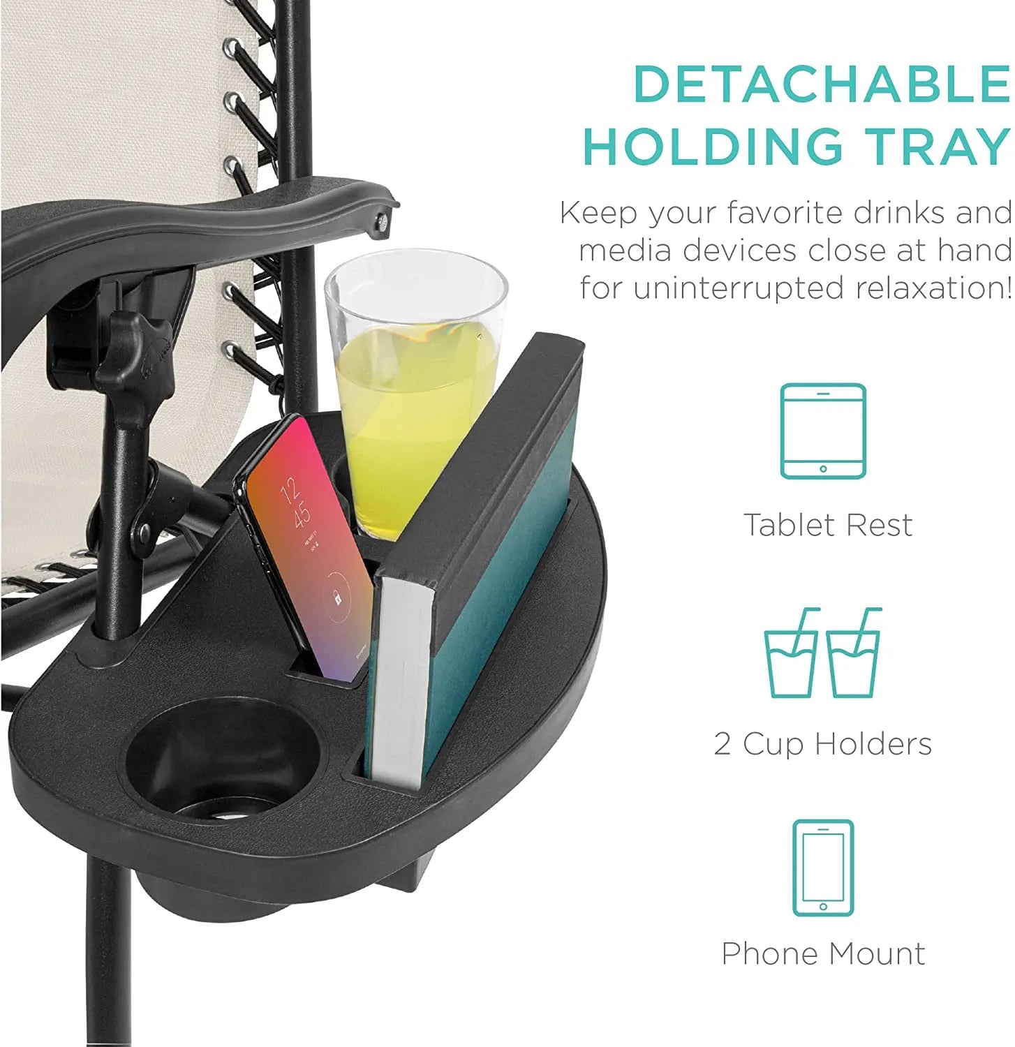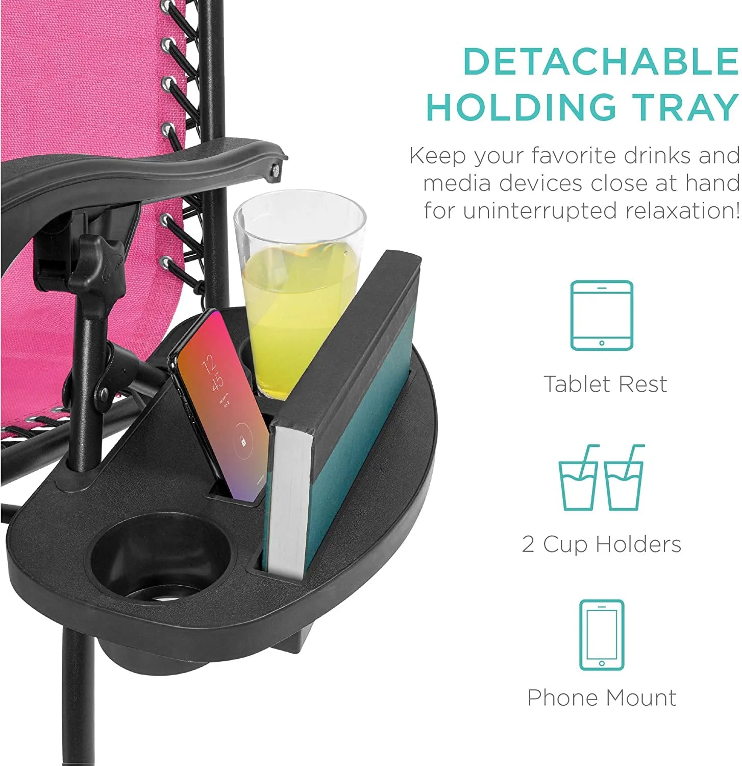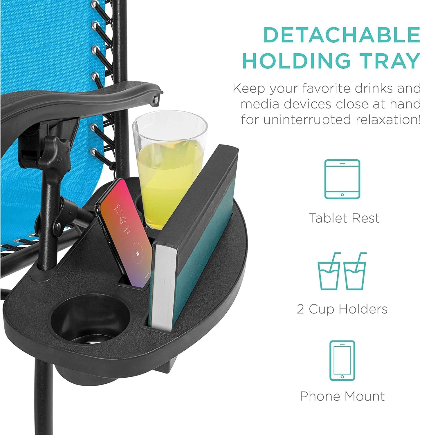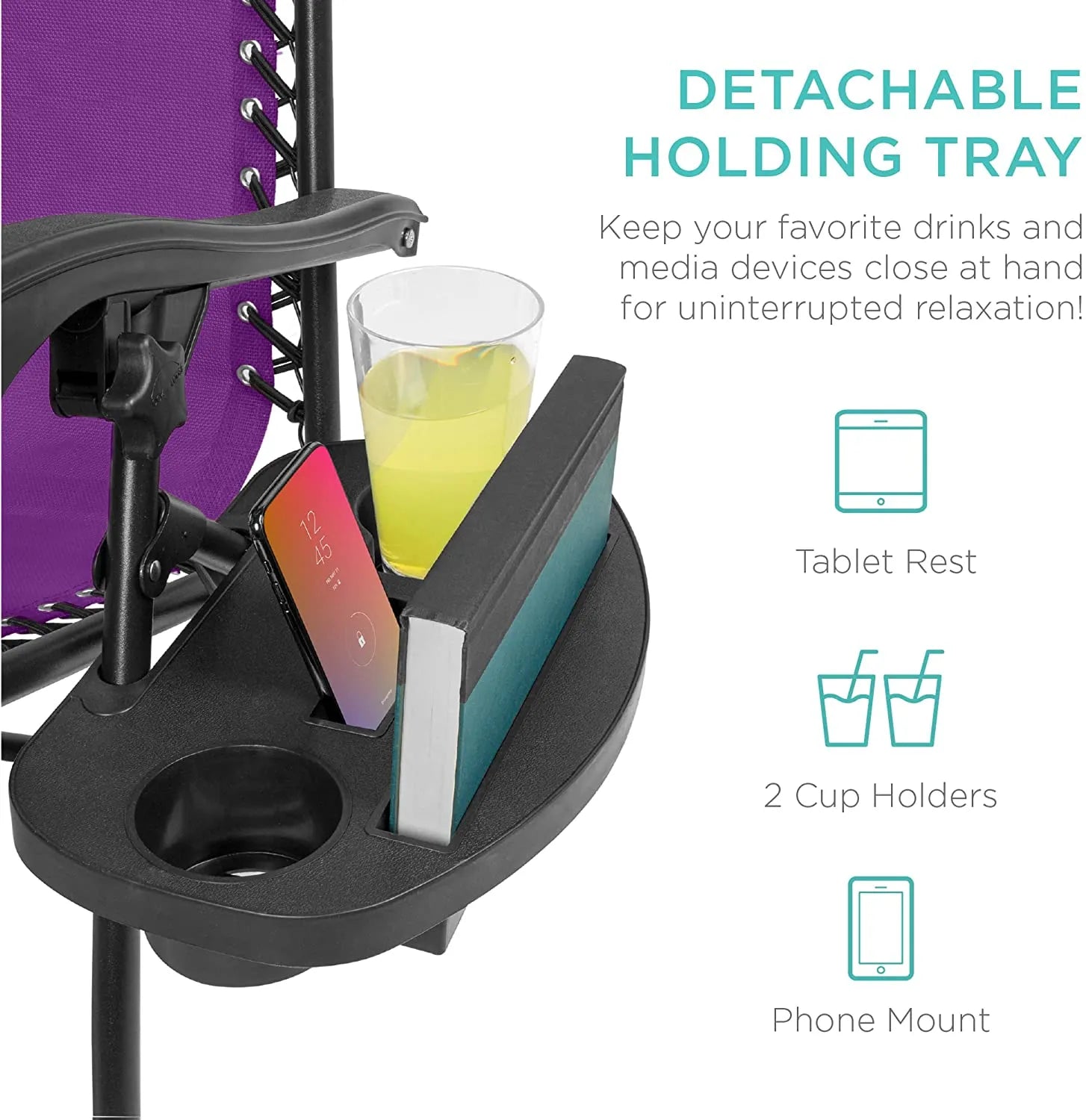 - CONVENIENT & DETACHABLE TRAY: Removable tray is built with two cup holders, a phone holder, and a tablet holder so you never have to be far from your favorite drinks or media devices!