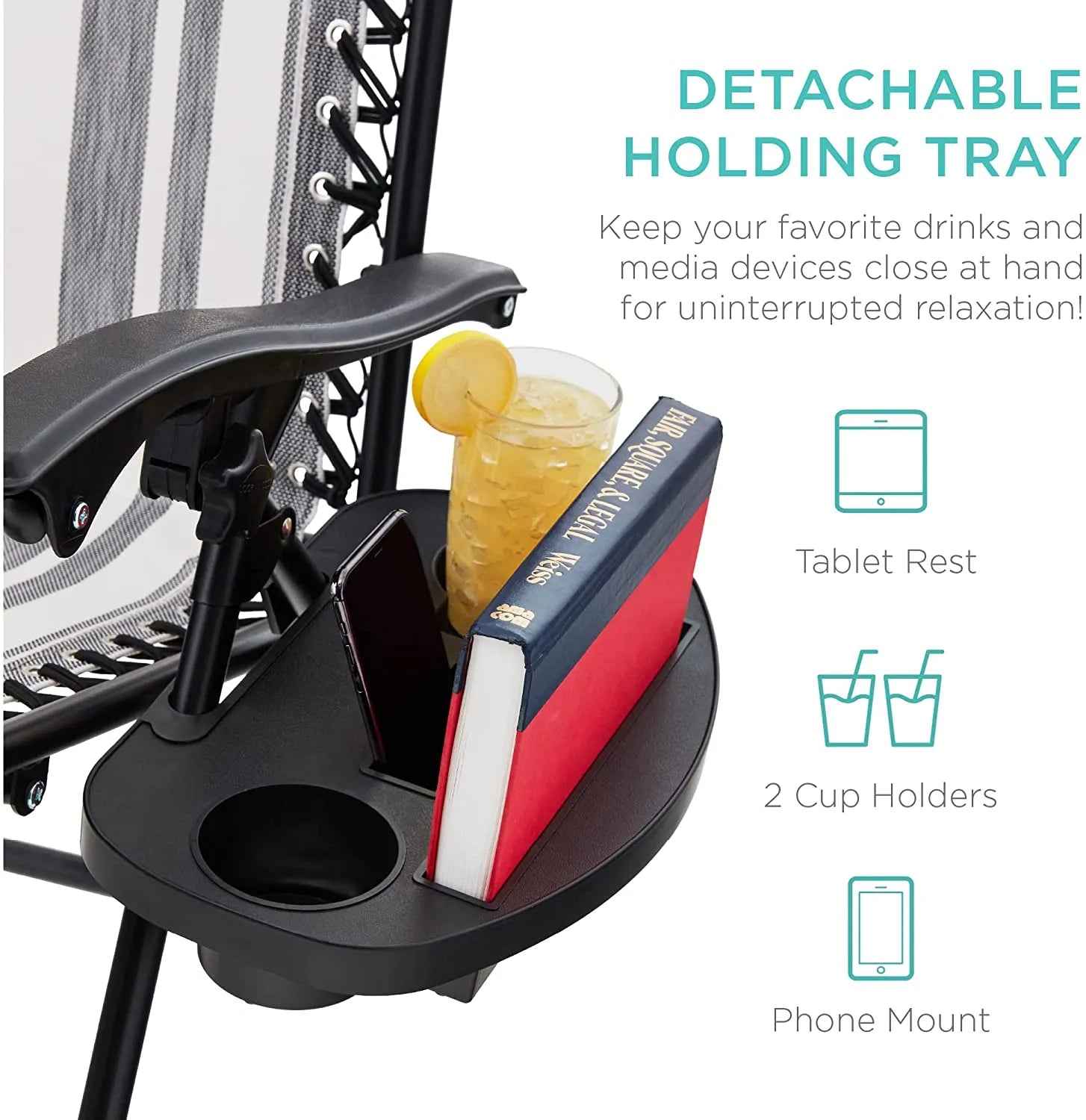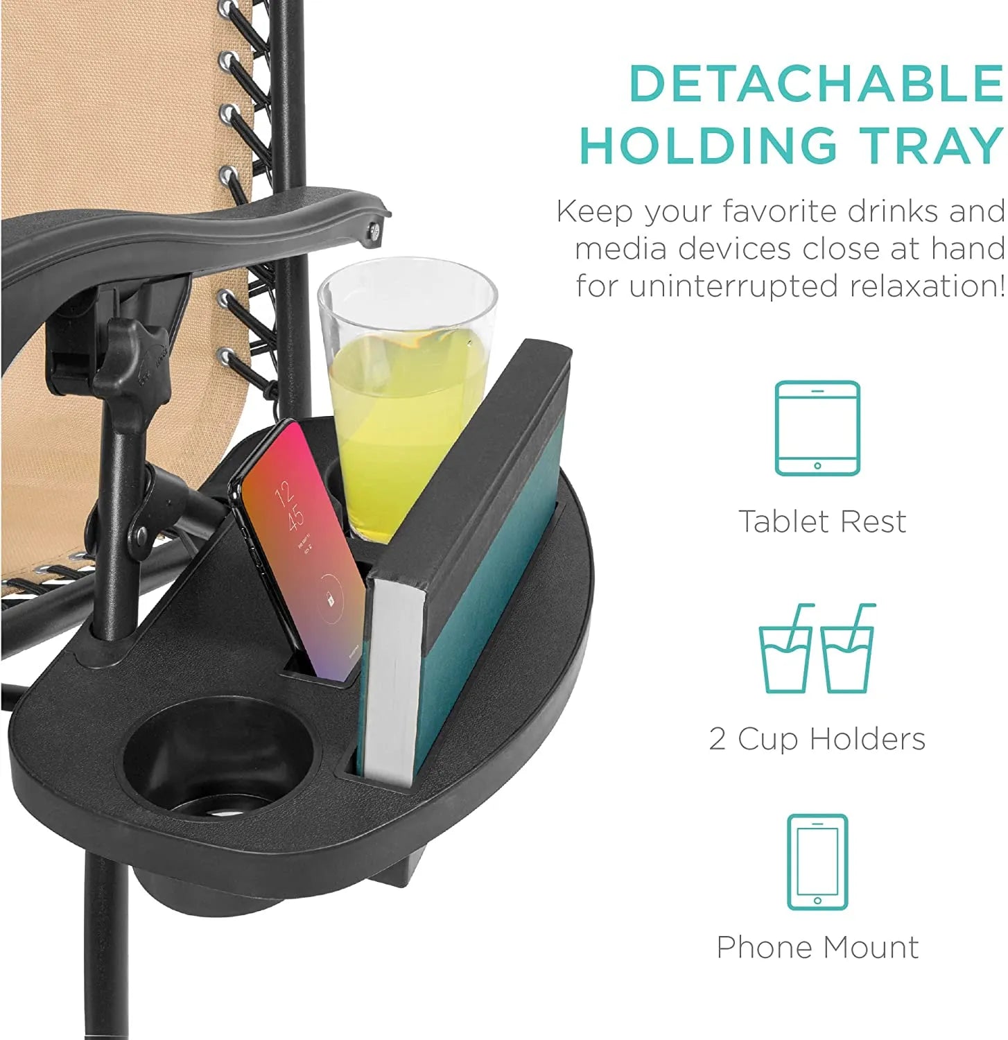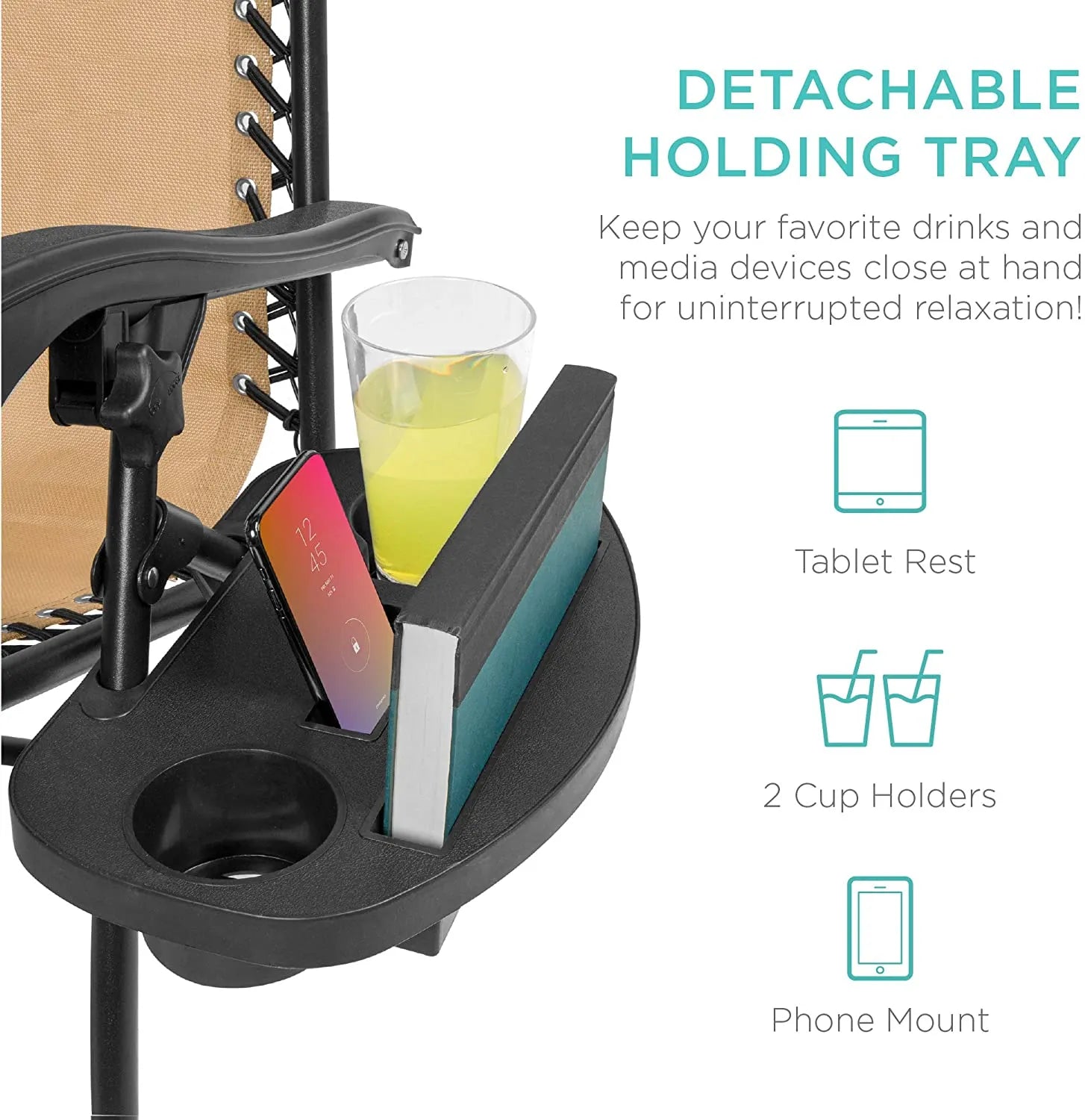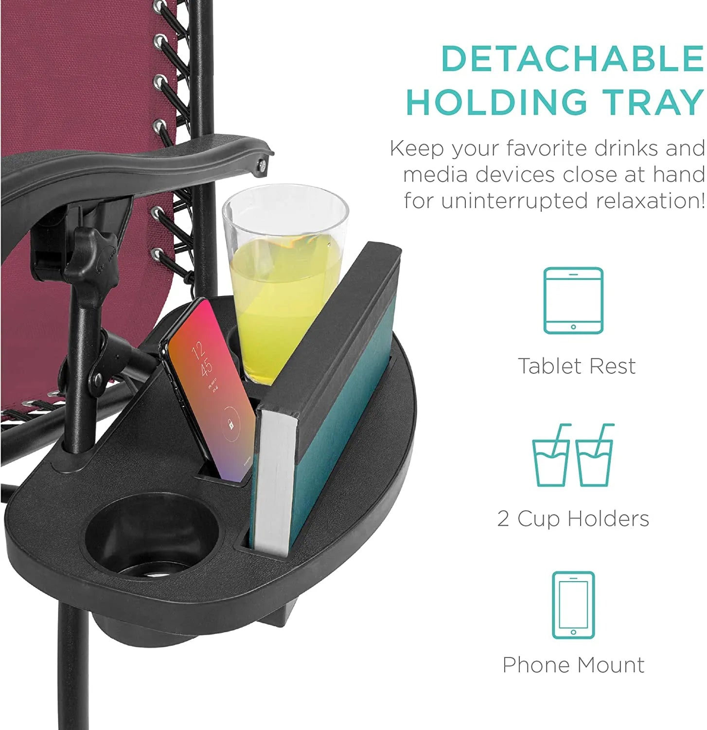 - CONVENIENT & DETACHABLE TRAY: Removable tray is built with two cup holders, a phone holder, and a tablet holder so you never have to be far from your favorite drinks or media devices!