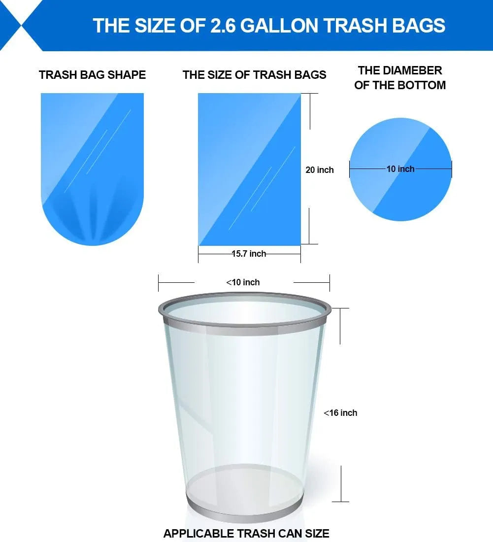 • 【100% Customer Satisfaction】 If you're not satisfied with our small trash bags, please feel free to contact us. We won't just say try our 2.6 gallon garbage bags and love them, we're truly dedicated to your satisfaction.