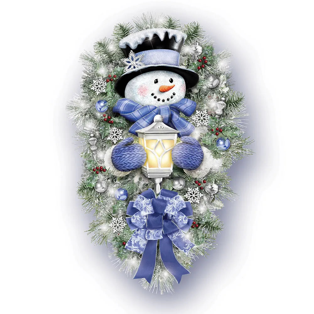 This teardrop-shaped wall lamp is inspired by the art of Thomas Kinkade, painter of light. A handcrafted snowman welcomes holiday visitors with a cloth scarf, bow, snowflake-glittering topper, and realistic "knita" mittens holding a lamp inspired by the artist's unique lampposts. The lamp is lit by two built-in LEDs that emit a warm yellow glow, while 26 white LEDs twinkle from the surrounding faux evergreen branches and decorative ornaments, snowflakes, holly leaves, and berry clusters. Lamp has a