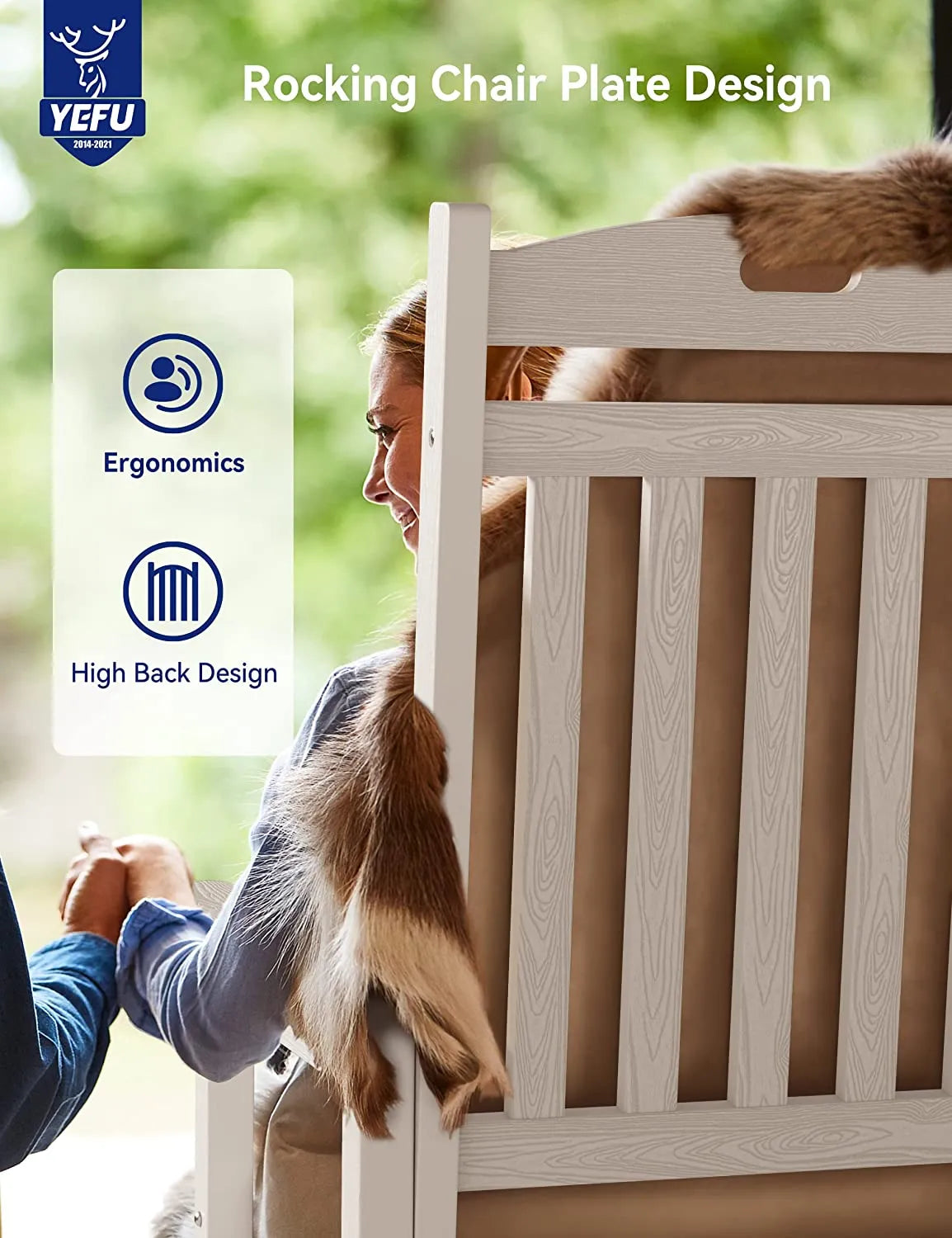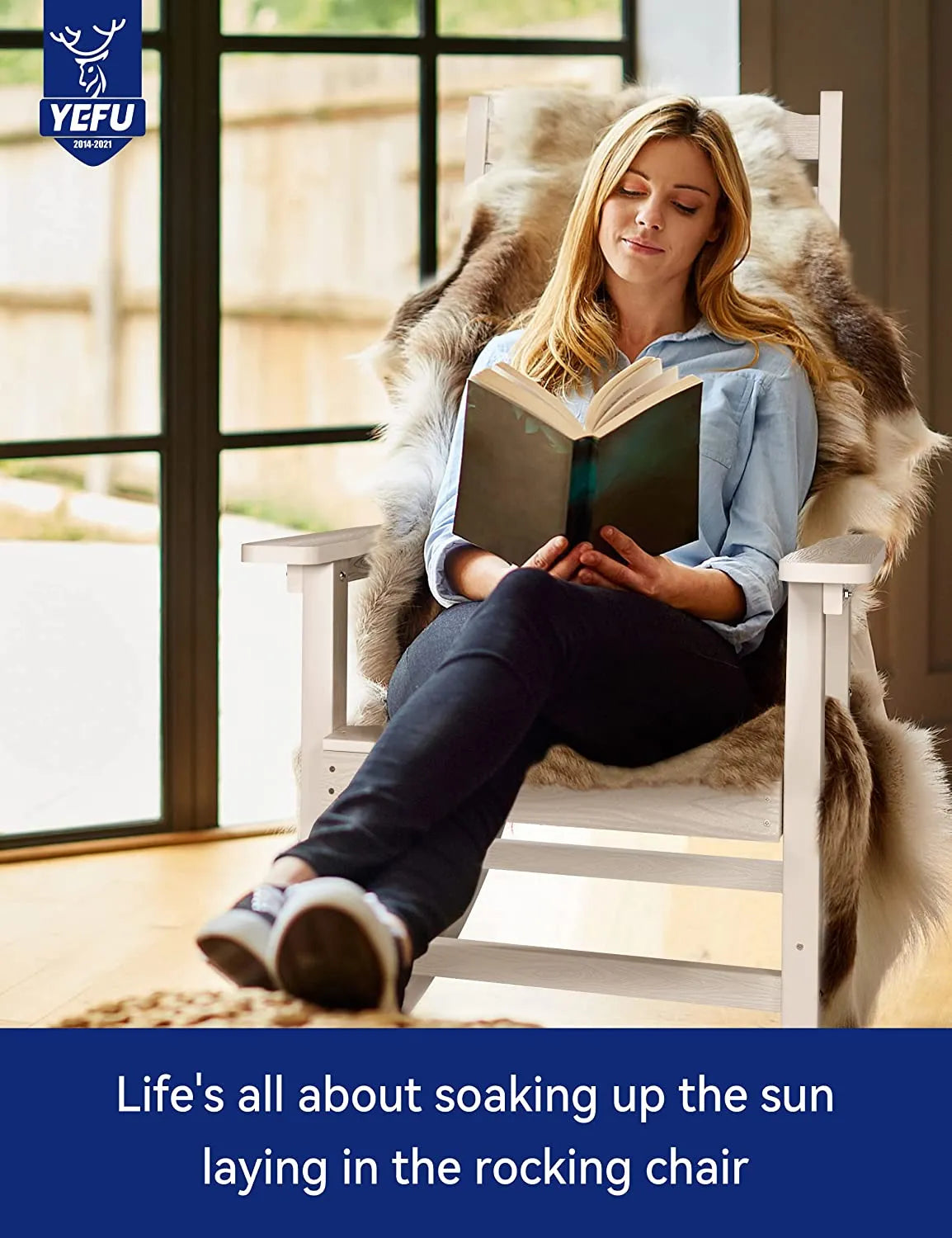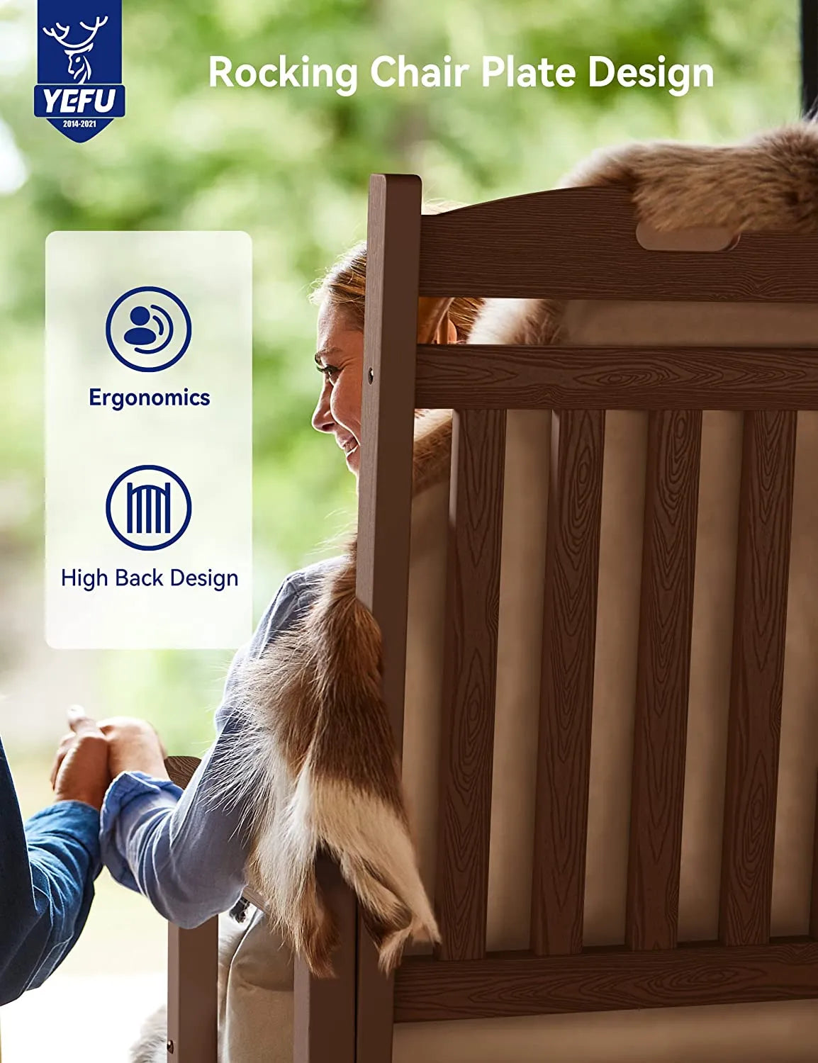 - Material: YEFU rocking chair is made of high impact polystyrene, which makes the surface material look more natural with a wooden feel. It is waterproof, anti-corrosion and anti-fading material, unlike wood which is easily rotten. Besides, the 304 stainless steel screws connected make the chair more durable.